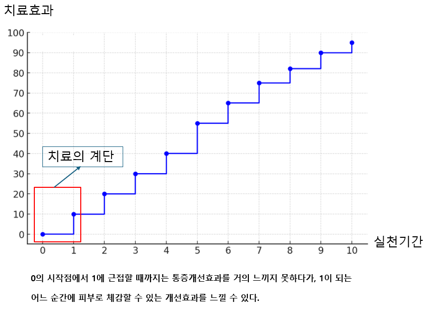 4. 실천의 효과는 결코 우상향의 1차 곡선이나 2차 곡선이 아니다. 그래서 매일매일 실천하더라도 상당기간 동안은 효과를 느낄 수 없기 때문에 정말 힘든 시기이고 이때 자주 포기하게 되는데, 이때를 잘 버티면 어느 순간 확연한 통증개선효과를 느낄 수 있다. 또한 그 후로도 실천과정에서 중간중간에 몇 번의 큰 시련 즉 통증이 찾아오는데, 잘못된 허리자세를 바르게 잡는 과정에서 나타나는 척추의 몸부림이라고 긍정적으로 생각하면 된다. 만약 그럴 때마다 포기하지 않고 잘 극복해 나가면 결국에는 디스크를 이겨낼 수 있다. 그래서 최소한 나의 경험만 놓고 보면 치료효과는 우상향의 계단모양으로 나타난다.